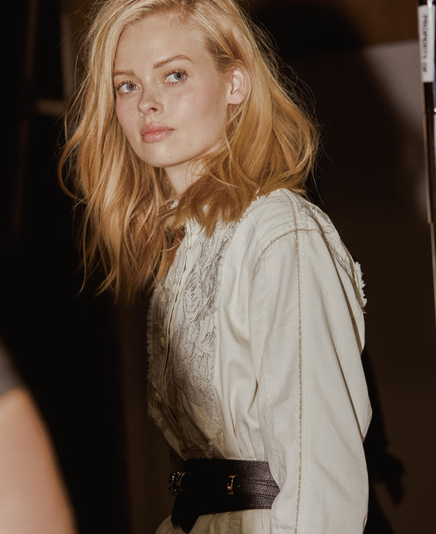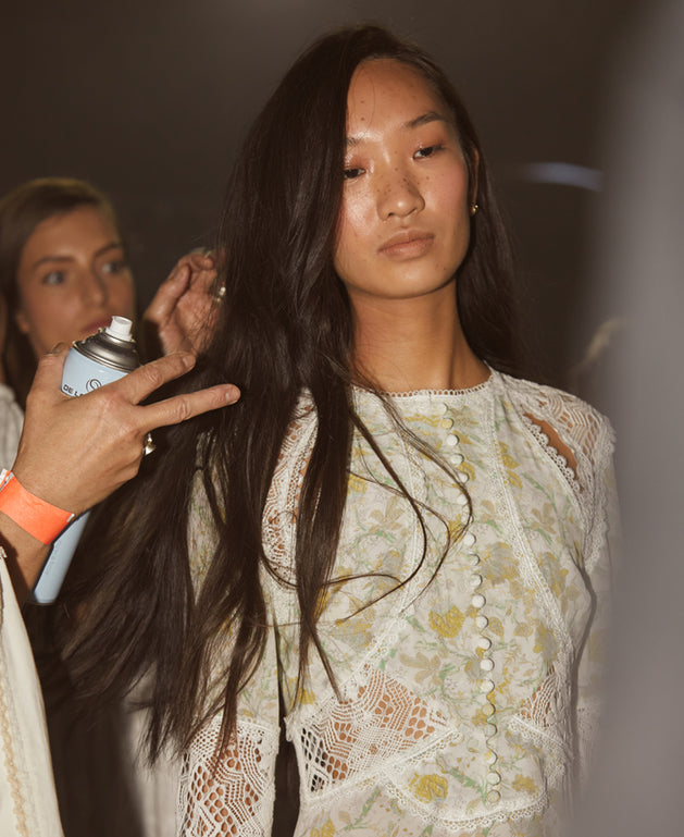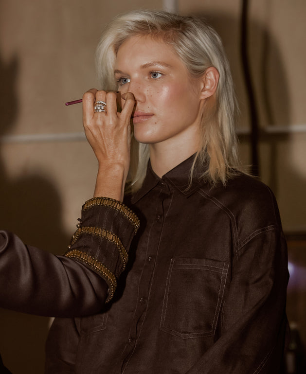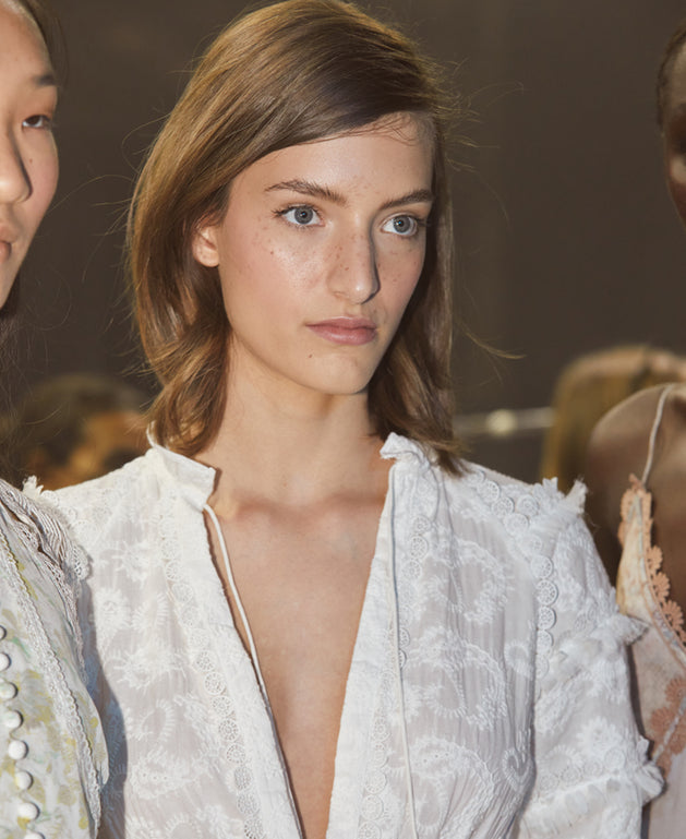 Sarah created dewy, perfected skin, with a touch of rosy flushed cheeks. A sheer glossy eye and a curled lash. Brushed up French-girl brows & faux freckles. Finished with a soft focus rose tinted lip.