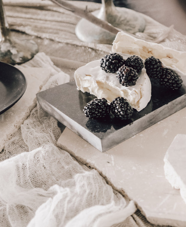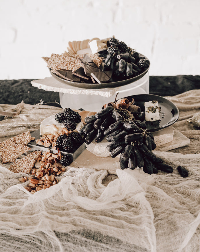 When it comes to grazing boards, The Hunted Yard re-invent the classic wooden cheese board stand with broken travertine tiles. "It always adds to the texture and the rawness if the travertine tiles are all slightly different colour tones and it's important to not shy away from imperfections."