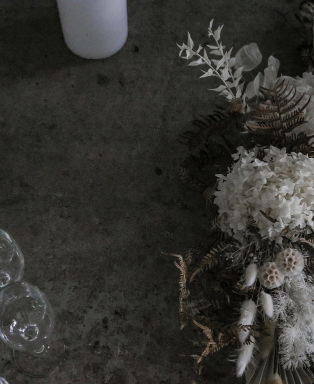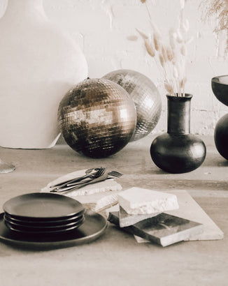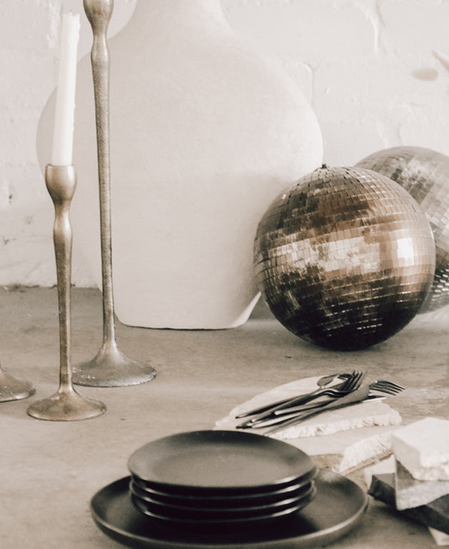 "Source old cheese cloths, re-purposed linen sheets, a cosy grazing board, smash some travertine tiles for layering. Cascades of candle wax are best so re-use old candles, brass tapered holders, aged disco balls with accents of gold spray will all create a nostalgic mood."