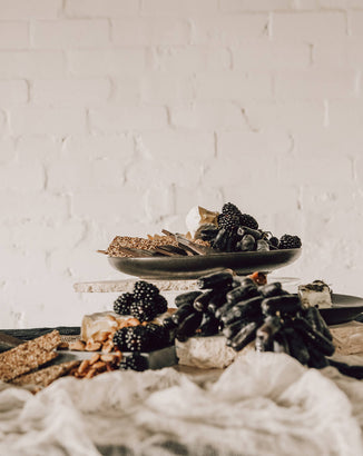 Layer the tiles as holders to mount all of your cheeses, favourite nibbles, grapes and dips onto. Don’t shy away from a generous serving of almonds and nuts to fill in the spaces and crackers to add to the textural palette.