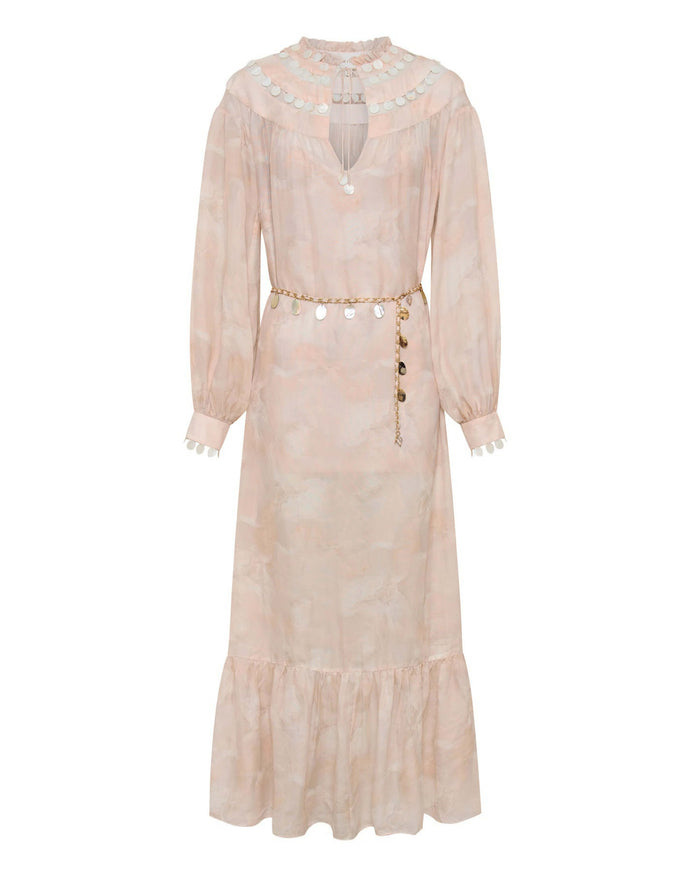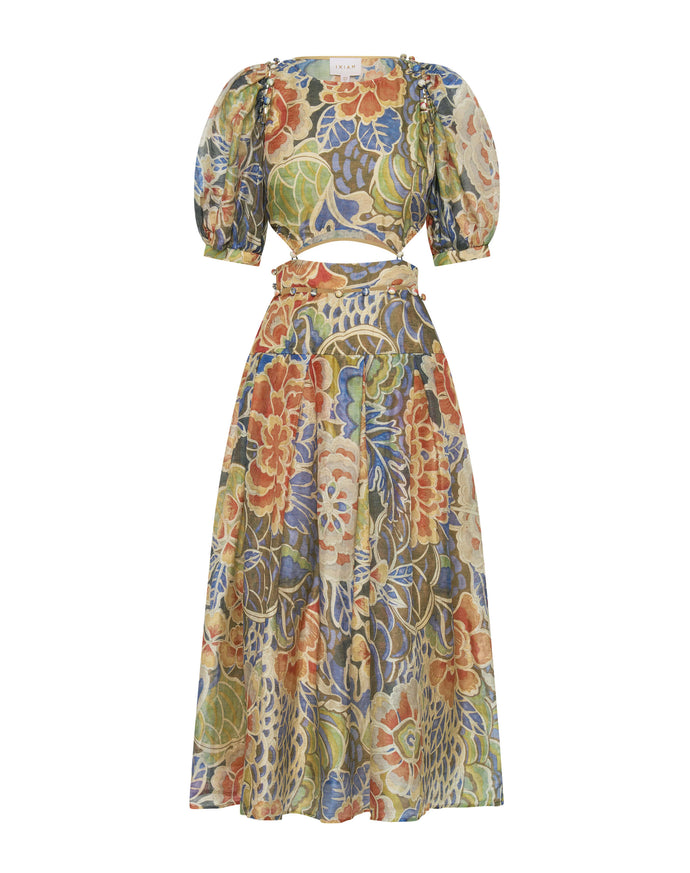 The Casablanca Maxi is a contemporary shirt dress featuring our vibrant vintage floral print. It boasts a structured collar, a tailored upper body, and central front buttons for a classic silhouette. The dress is completed with a flowing skirt, a matching belt, and a separate jersey slip for lining.